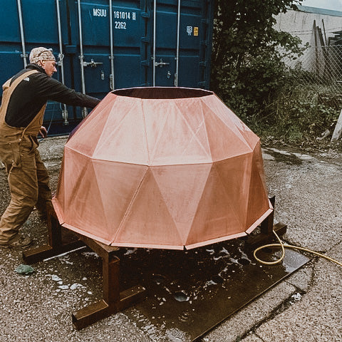 Designing the pot stills from scratch in Autocad. The brief was maximum copper contact, with high internal reflux. The flat panels of the geodesic allow just that, creating a refined spirit.