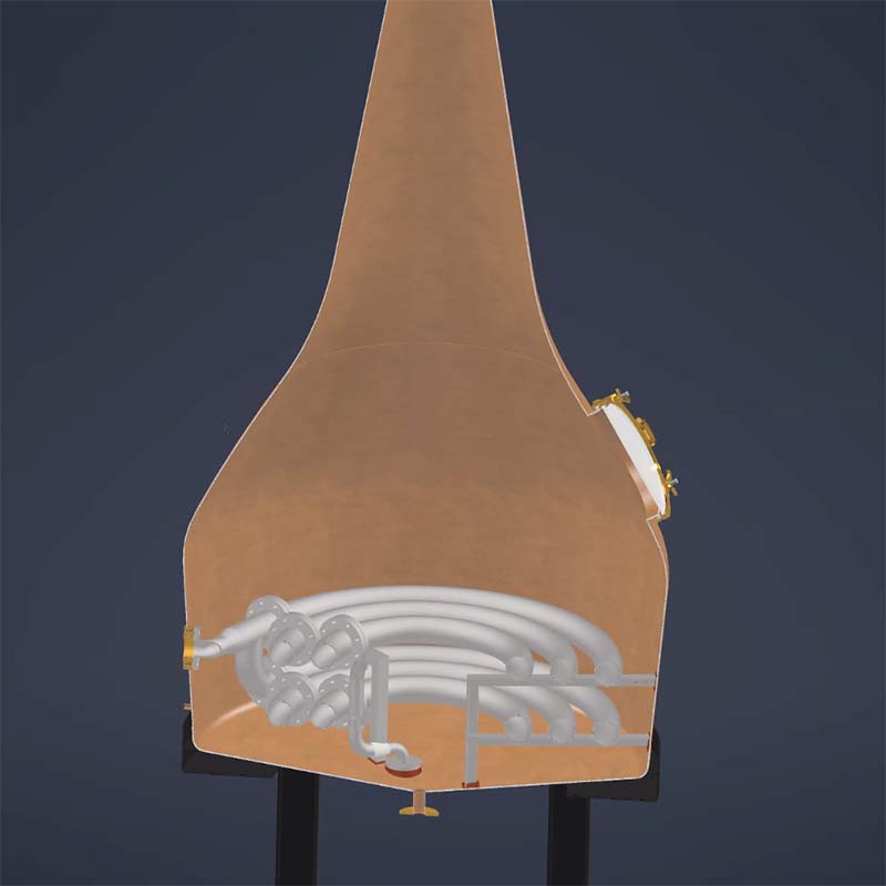 The larger surface area and volume of copper all leads to more copper contact with the spirit. More copper contact removes sulphurs and has a catalyst role in converting thiols and mercaptans to usually less pungent compounds. The flat sides encourage high reflux levels and enhances the removal of these compounds, promoting the development of the fruity, estery clean spirit.
